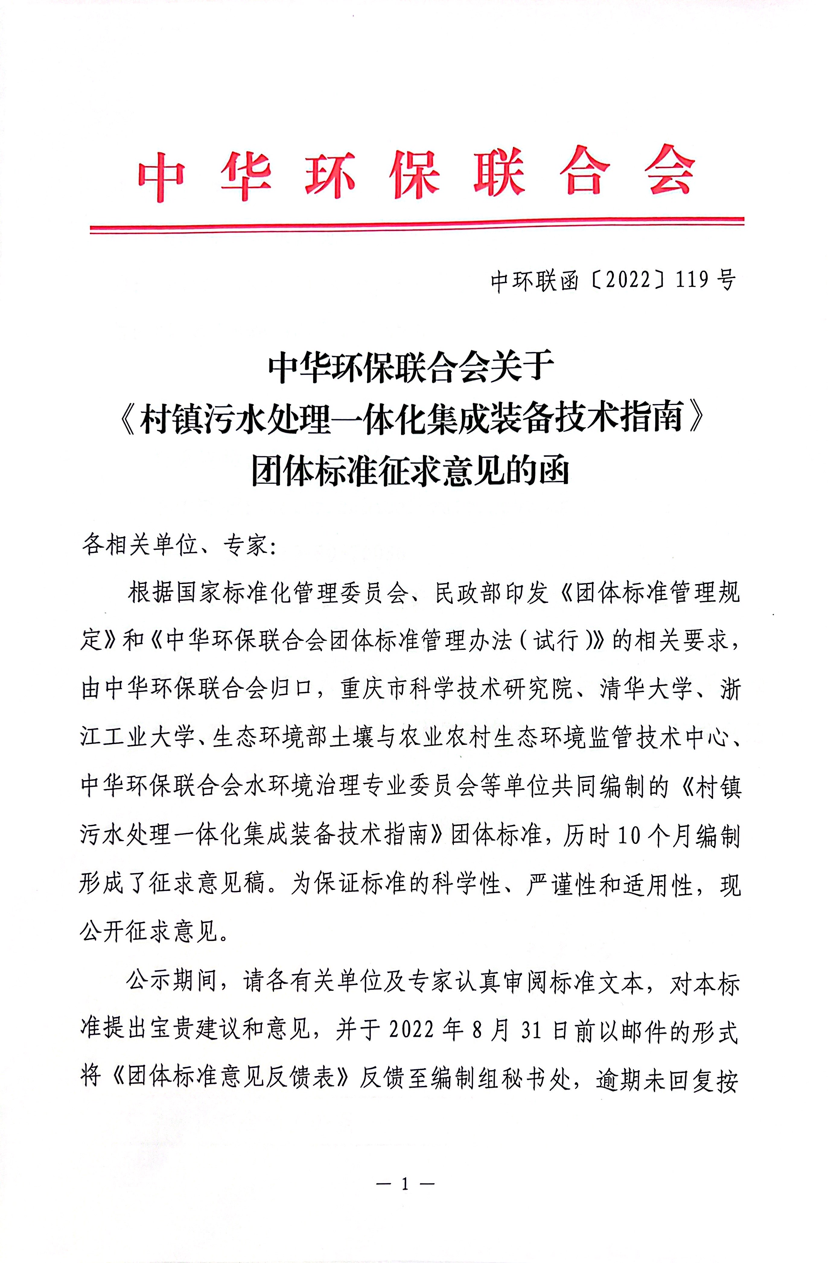 关于《村镇污水处理一体化集成装备技术指南》 团体标准征求意见的函