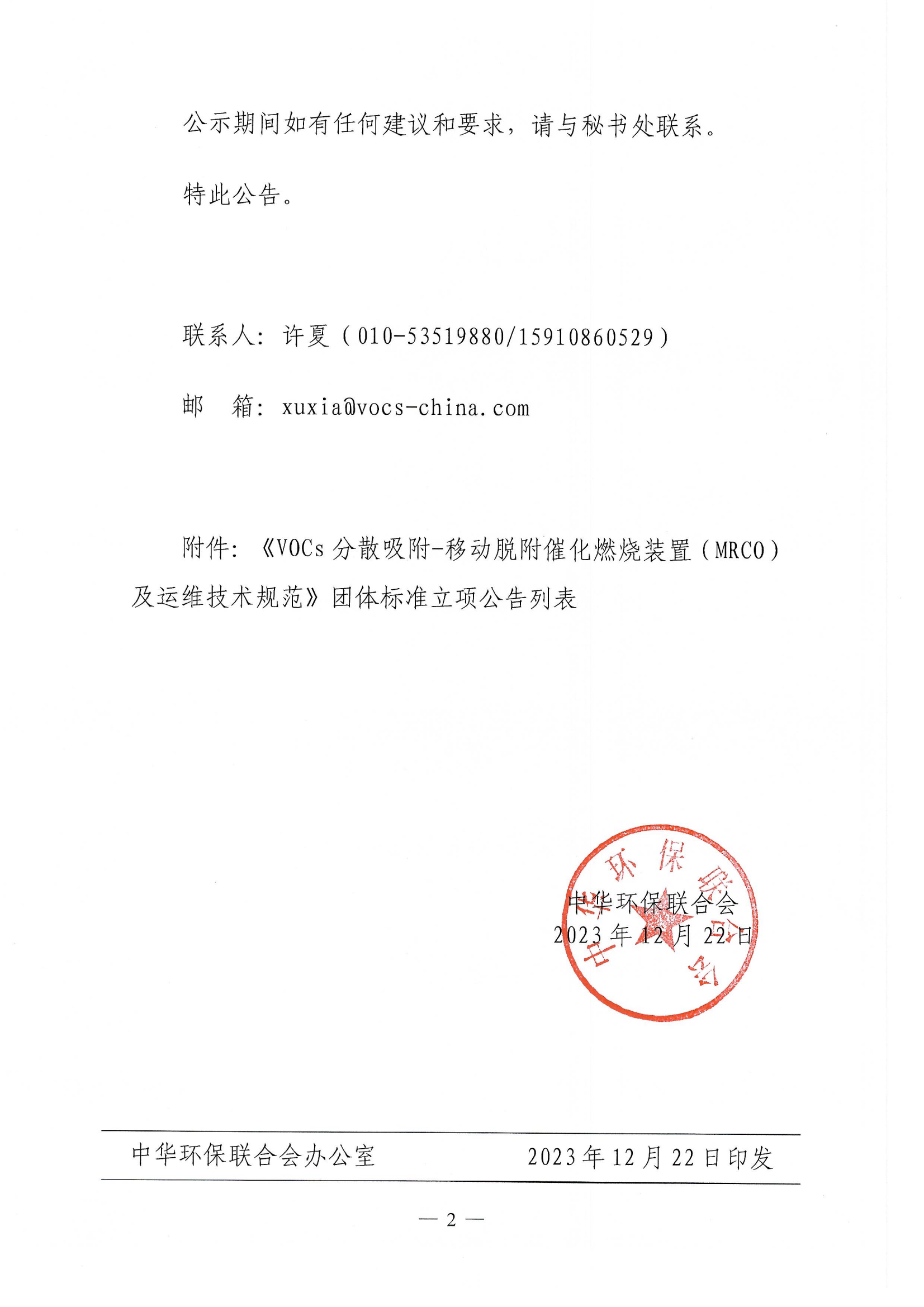 关于《VOCs分散吸附-移动脱附催化燃烧装置(MRCO)及运维技术规范》团体标准立项的公告