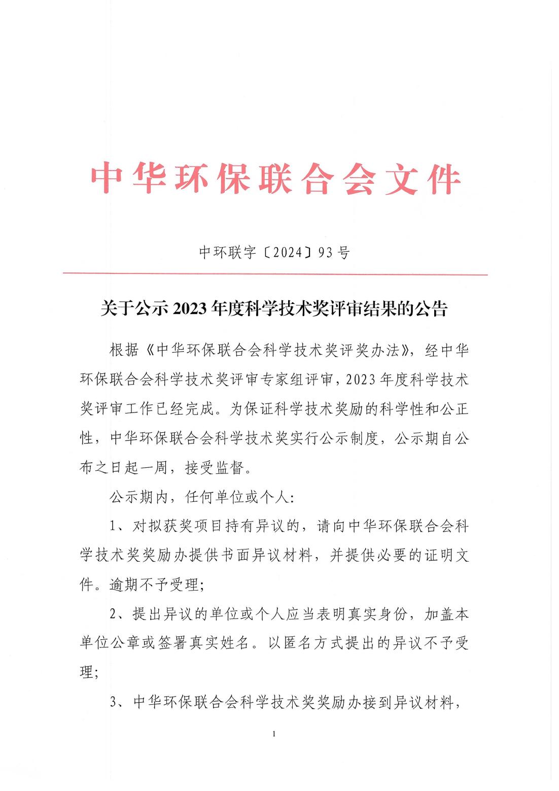 中华环保联合会关于公示2023年度科学技术奖评审结果的公告