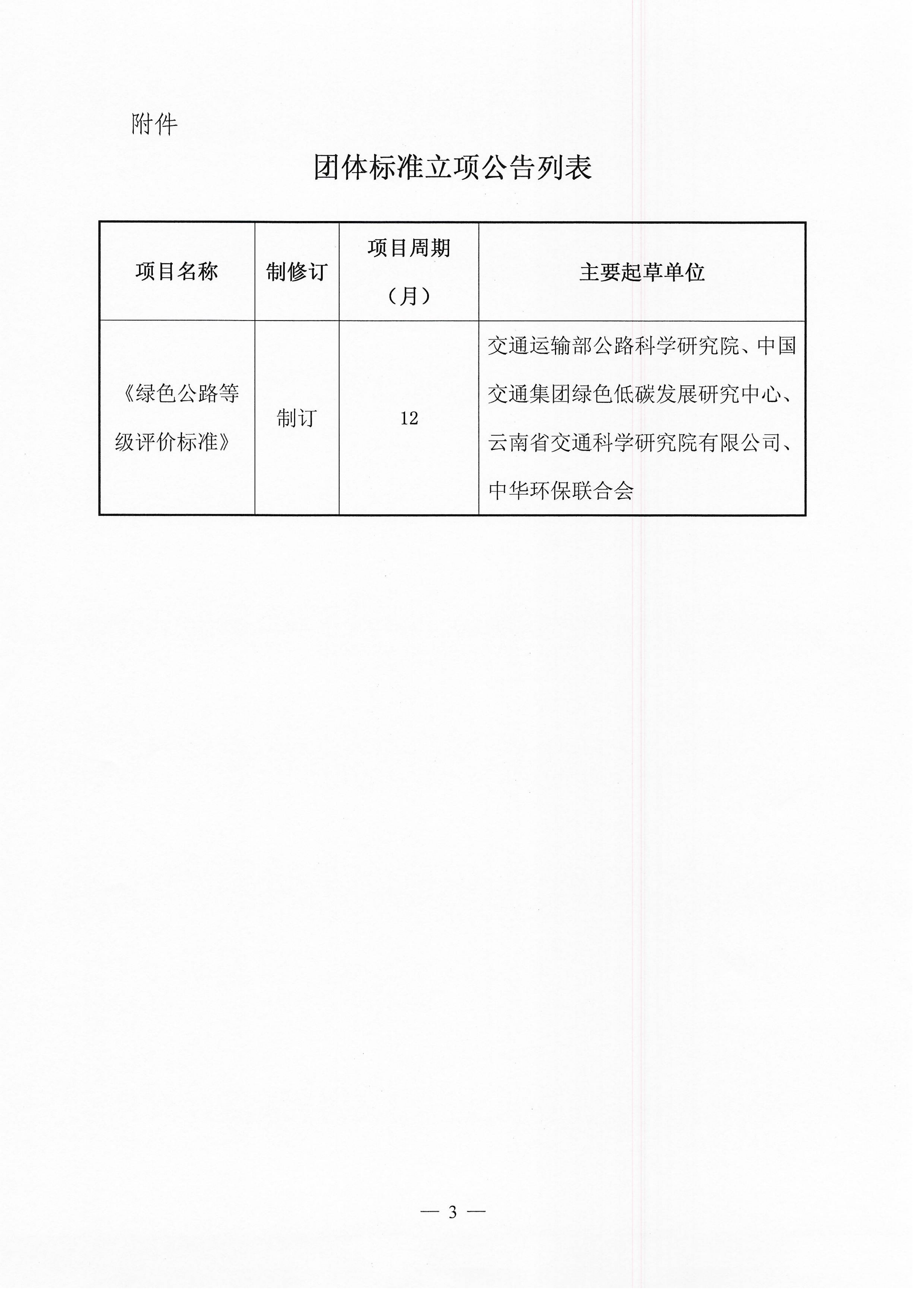 中华环保联合会关于《绿色公路等级评价标准》团体标准立项的公告
