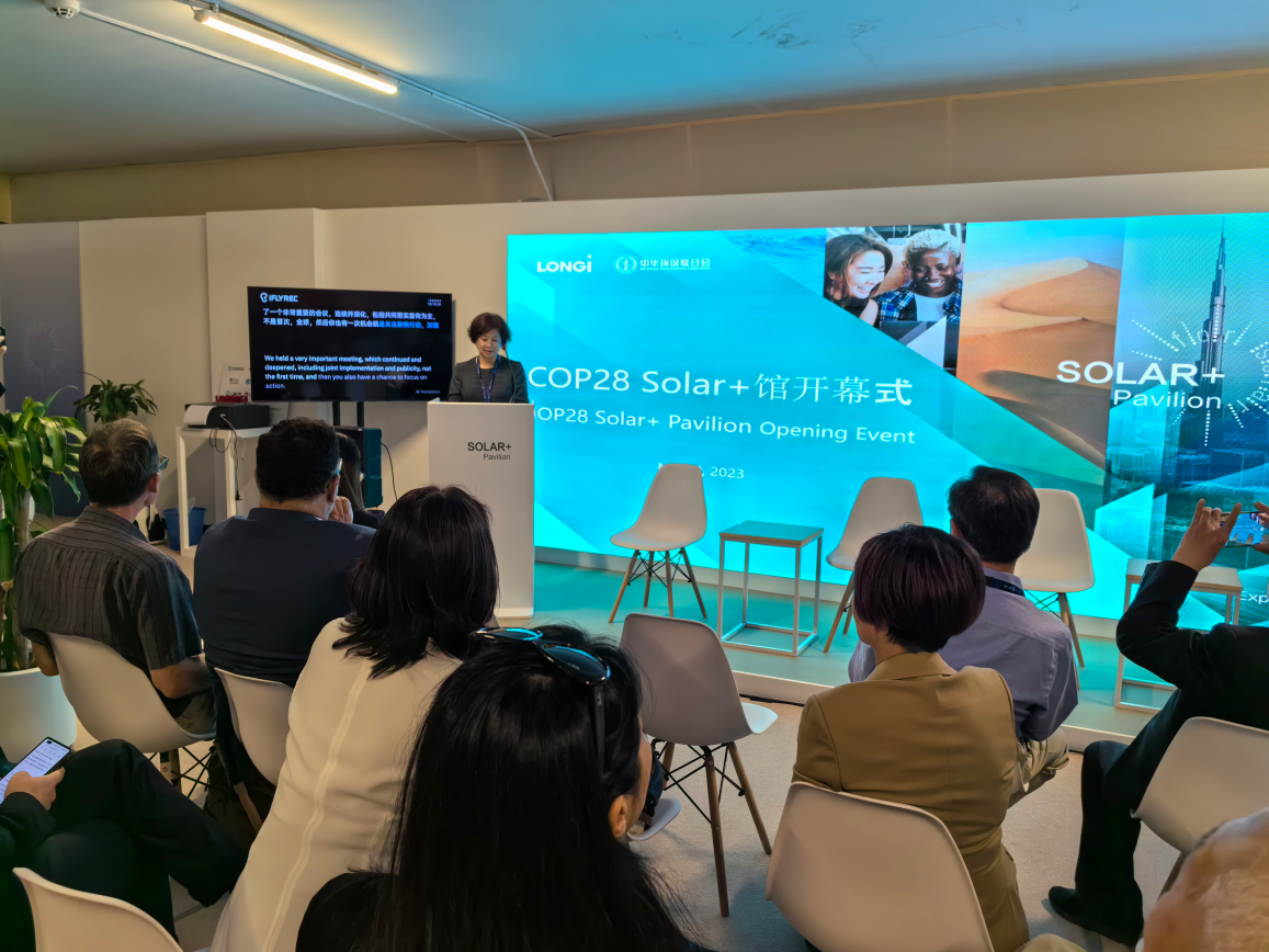 Solar+馆开幕式——11月30日,气候大会开幕日当天,谢玉红秘书长出席联合会COP28独立场馆“Solar+馆”开幕式并致辞,为与会来宾分享中华环保联合会大中华、大环境、大联合的理念,以及与隆基绿能共同建设Solar+馆、推动光伏全面助力联合国可持续发展目标的思路。开幕仪式上,腾讯集团、北京排水集团以及来自美洲、欧洲、非洲的国际嘉宾,围绕光伏助力可持续发展主题,分享了各自的探索和实践。