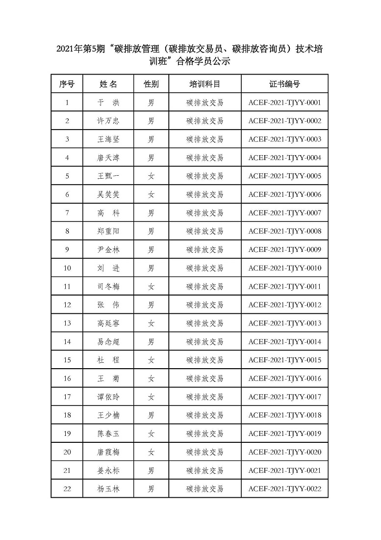 2021年第5期“碳排放管理(碳排放交易员、碳排放咨询员)技术培训班”合格学员公示