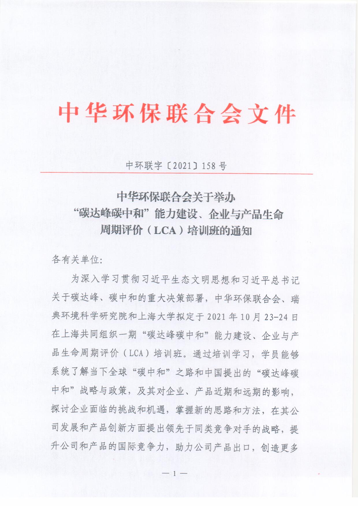 关于举办“碳达峰碳中和”能力建设、企业与产品生命周期评价(LCA)培训班的通知