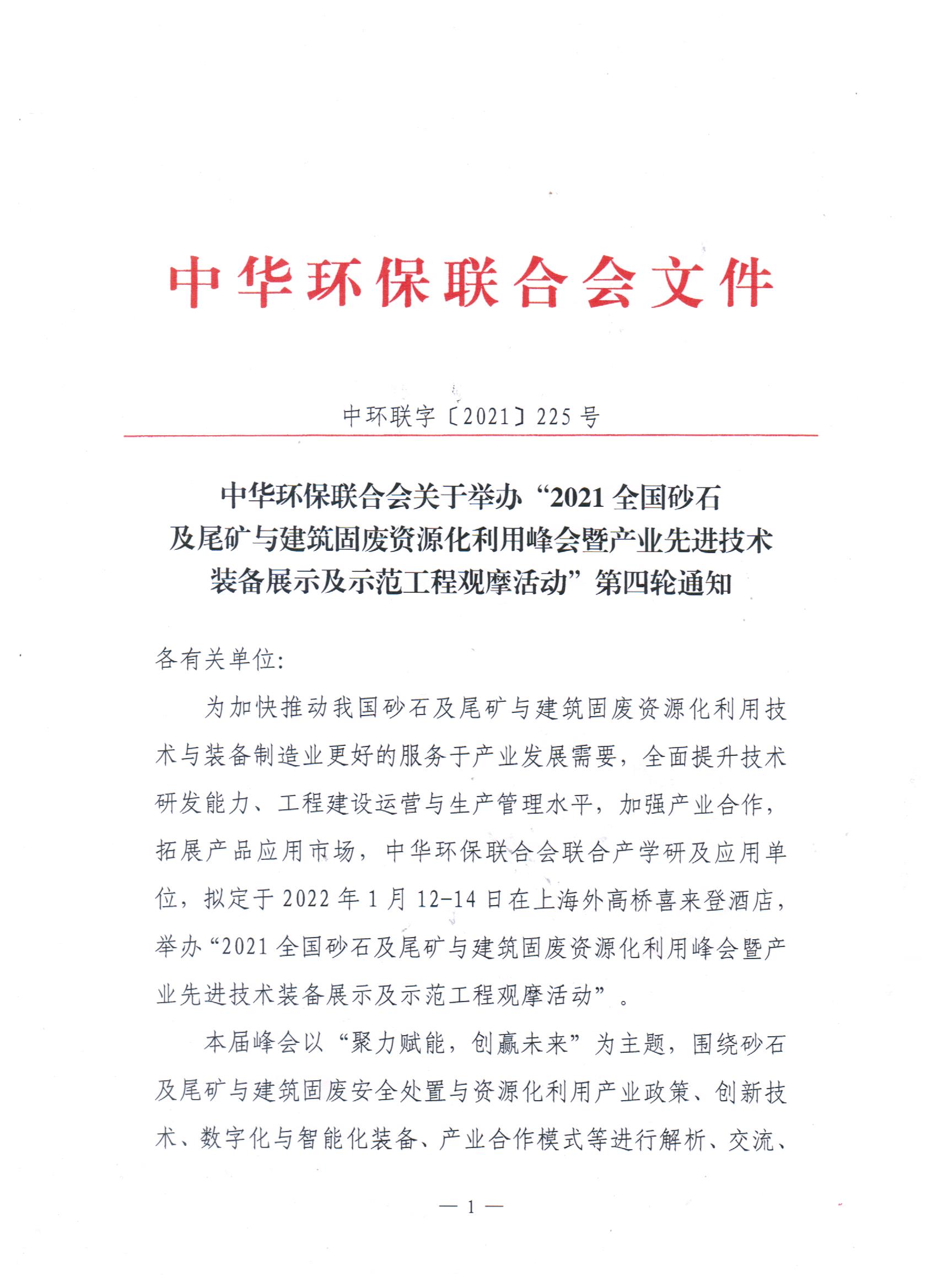 关于举办“2021全国砂石及尾矿与建筑固废资源化利用峰会暨产业先进技术装备展示及示范工程观摩活动”第四轮通知