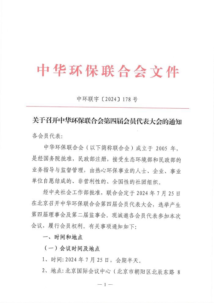 关于召开中华环保联合会第四届会员代表大会的通知
