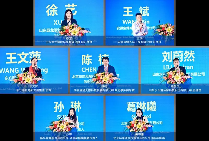 在随后的中方企业发言环节中,山东巨龙智能科技有限公司副总经理徐艺、安徽宝绿光电工程有限公司总经理王斌、东方雨虹海外发展集团总裁王文萍、滴滴政府事务副总裁陈楠、山东水长清环保科技股份有限公司总经理刘蔚然、晶科能源全球可持续发展负责人孙琳、北京科净源科技股份有限公司国际部部长葛琳曦等企业代表分别围绕“技术与解决方案及投资方向”也在活动现场分享了他们的绿色技术和成功案例。