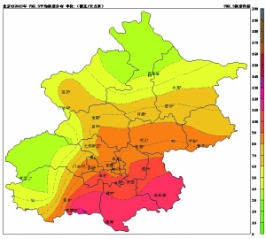 另外,从PM2.5分布上看,存在着明显的南高北低的情况(见图),北部密云水库和八达岭PM2.5平均浓度为60微克/立方米,比全市平均低30%,而南部琉璃河、大兴榆垡等地年均浓度达110至120微克/立方米,比全市平均高30%。中心城区大致在90微克/立方米左右。交通监测站点的PM2.5浓度也比全市平均高15%以上。
