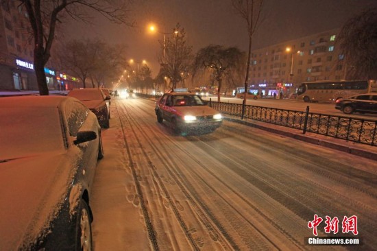 11月30日,吉林市民和车辆在积雪的路上前行。当日是11月的最后一天,吉林省迎来今年入冬以来最明显的降雪降温天气,不仅大到暴雪光临,气温也将一路跳水,局地降温20℃。吉林省气象部门29日发布明显降雪、大风和寒潮降温预报,预计从今天至12月3日吉林省将出现入冬以来最明显的一次降雪降温大风天气过程。 中新社发 图片来源:CNSPHOTO