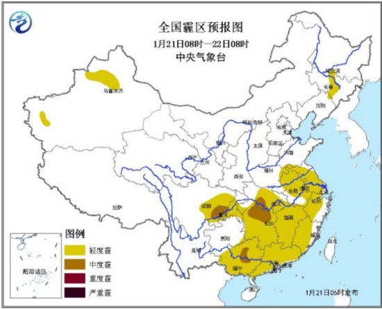 21日08时~22日08时,受冷空气影响,中东部大部地区雾、霾减弱或消散;华北东南部、黄淮西部、江淮西部、江汉、江南西部、四川盆地、广西中东部、广东西部等地的空气污染气象条件为3级,部分地区4级,将有轻至中度污染天气。