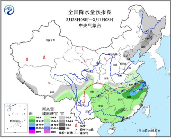 预计今天白天到夜间,华北东部、东北地区大部、西藏南部和东北部、川西高原西北部、江汉南部、黄淮南部、江淮中东部等地有小到中雪或雨夹雪;西南地区东部、江淮西南部、江南、华南大部、西藏东南部等地有小到中雨,江南东北部的部分地区有大雨;局地并将伴有雷雨。