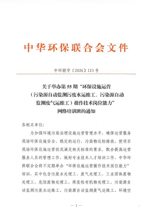 关于举办第55期“环保设施运营(污染源自动监测污废水运维工、污染源自动监测废气运维工)操作技术岗位能力”网络培训班的通知