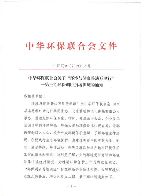 关于“环境与健康普法万里行”——第三期环保调研员培训班的通知