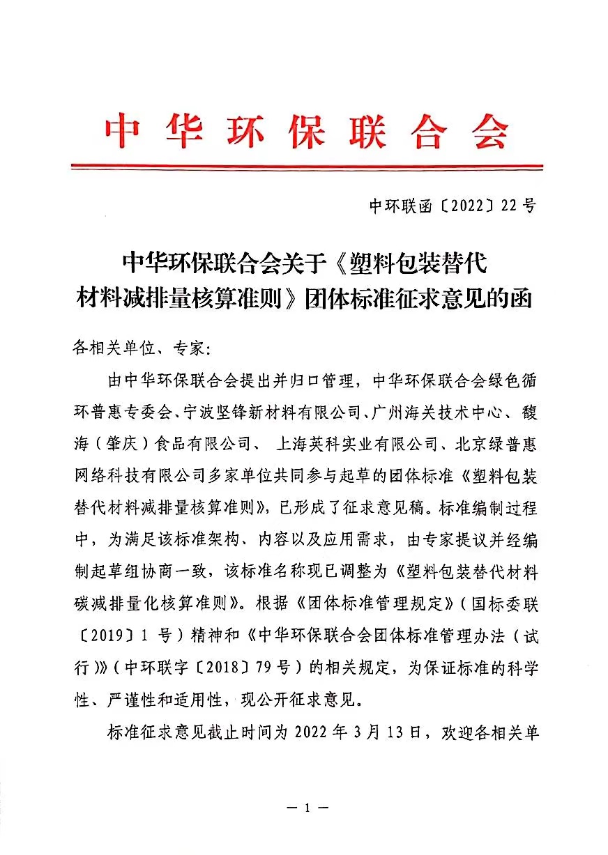 中华环保联合会关于《塑料包装替代材料减排量核算准则》团体标准征求意见的函