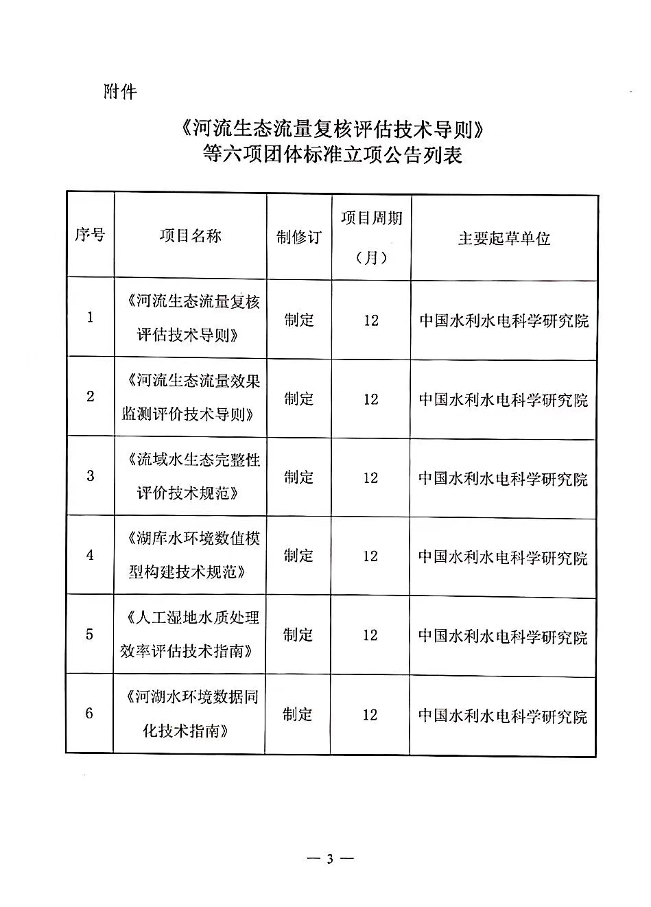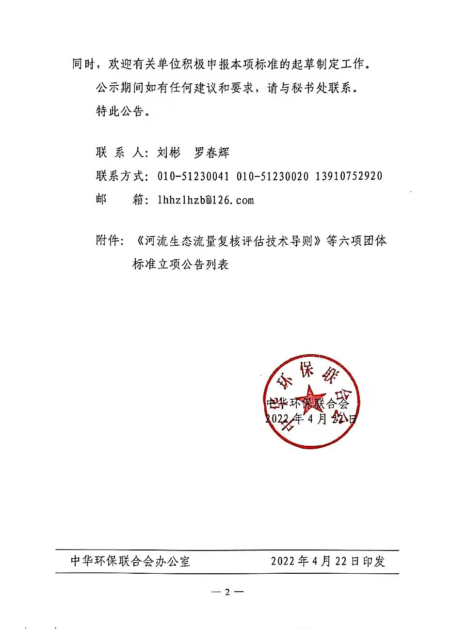 中华环保联合会关于《河流生态流量复核评估技术导则》等六项团体标准立项的公告