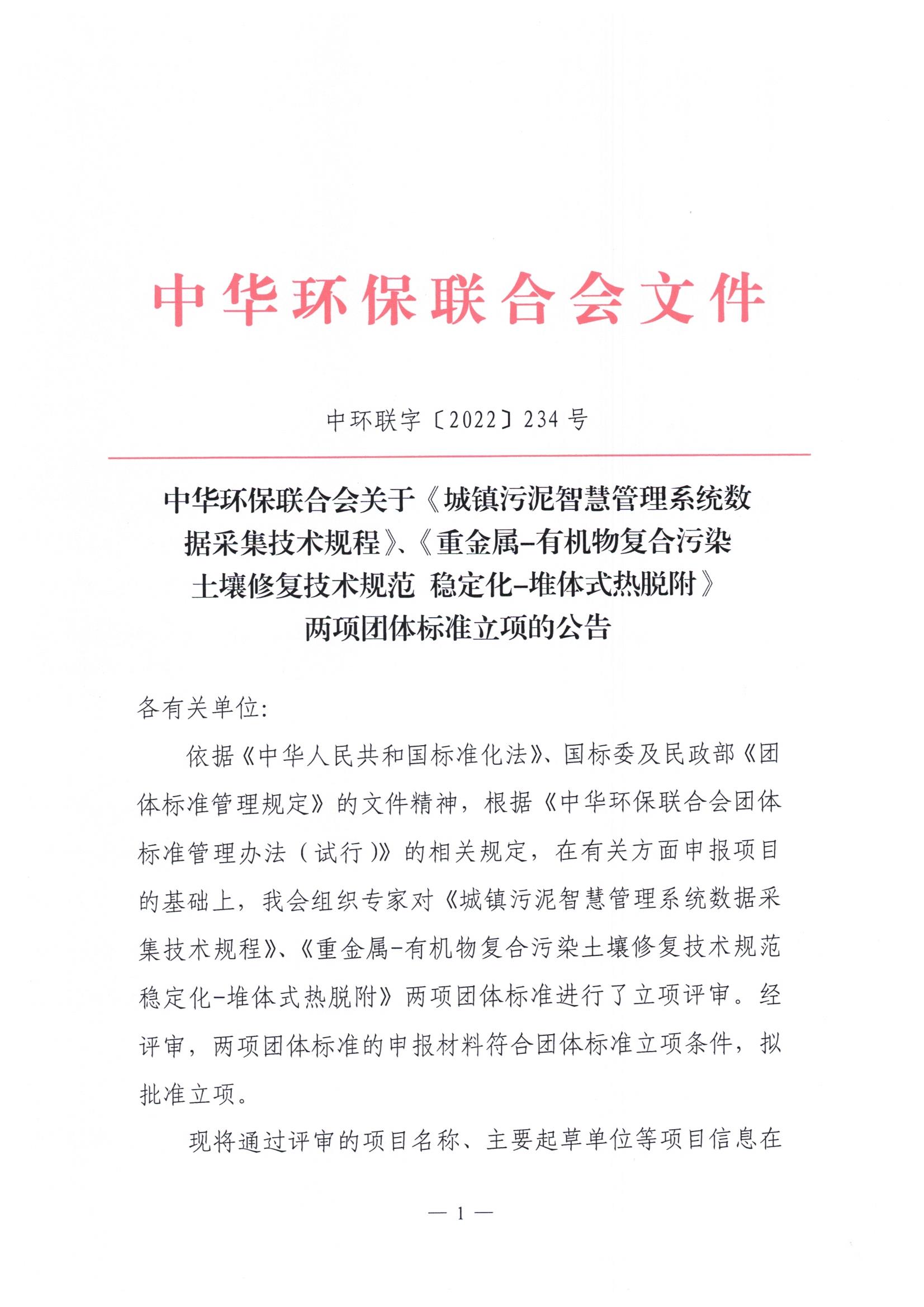 关于《城镇污泥智慧管理系统数据采集技术规程》《重金属-有机物复合污染土壤修复技术规范 稳定化-堆体式热脱附》两项团体标准的立项公告