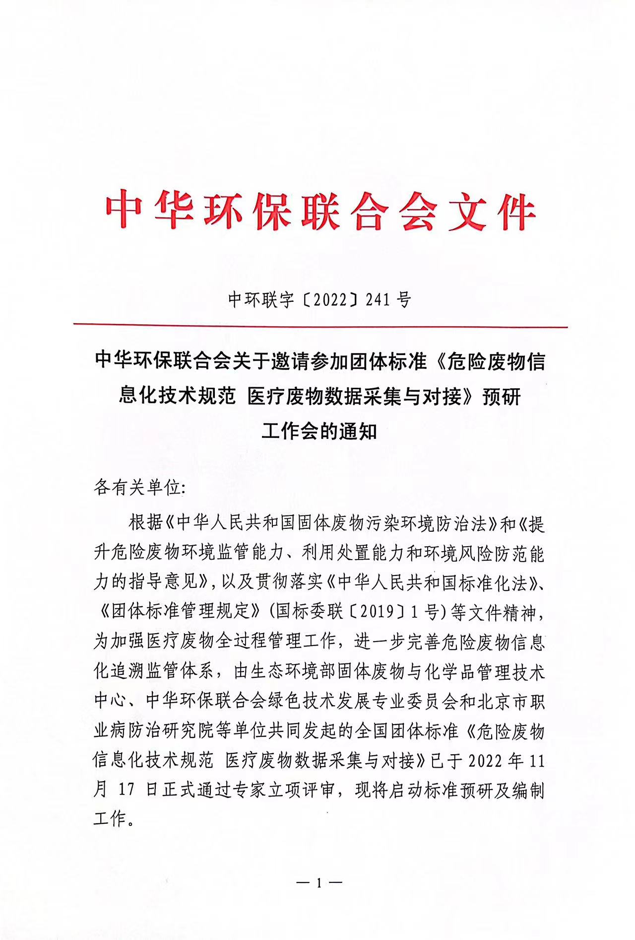 关于邀请参加团体标准《危险废物信息化技术规范 医疗废物数据采集与对接》预研工作会的函
