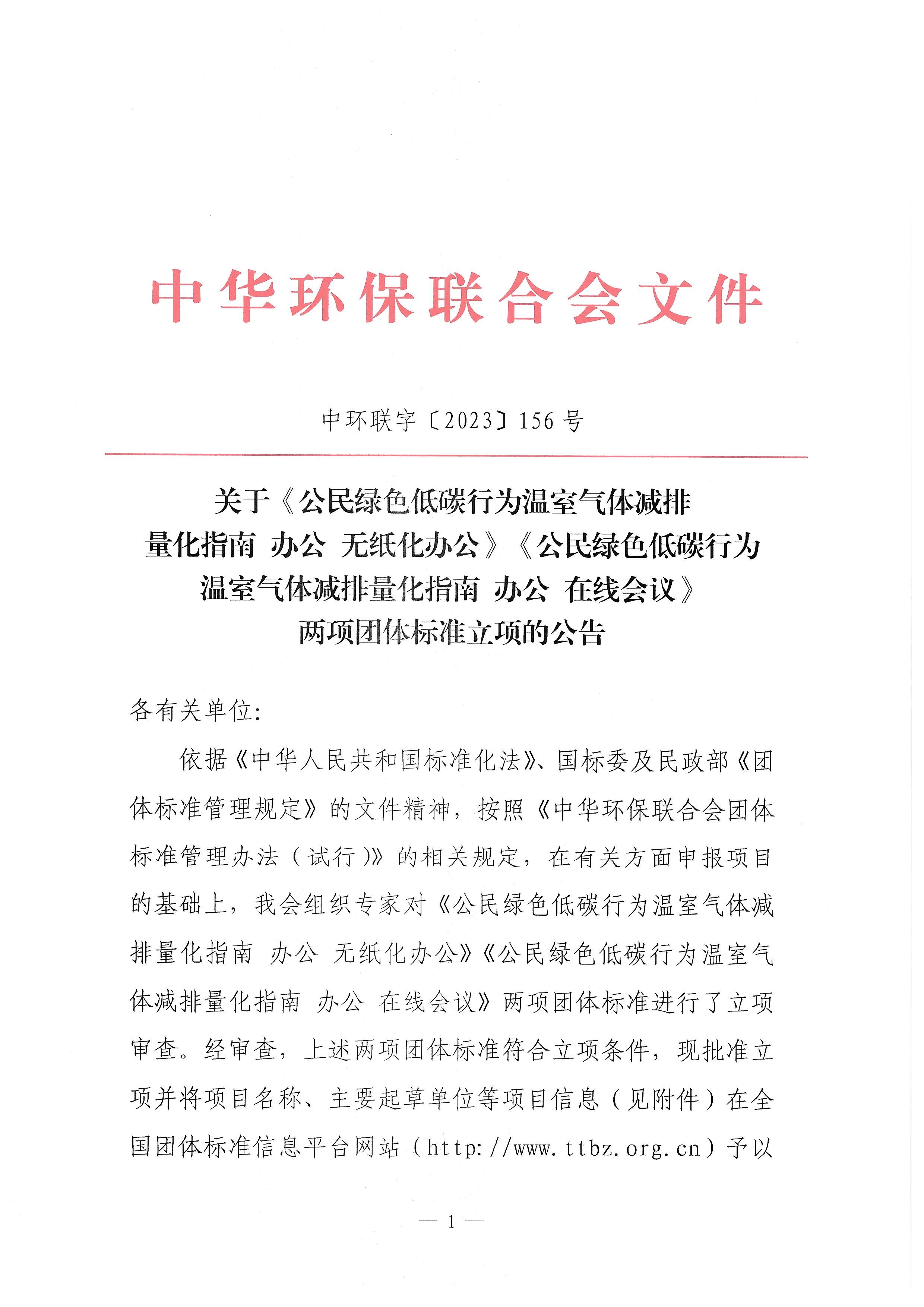 关于《公民绿色低碳行为温室气体减排量化指南 办公 无纸化办公》《公民绿色低碳行为温室气体减排量化指南 办公 在线会议》两项团体标准立项的公告