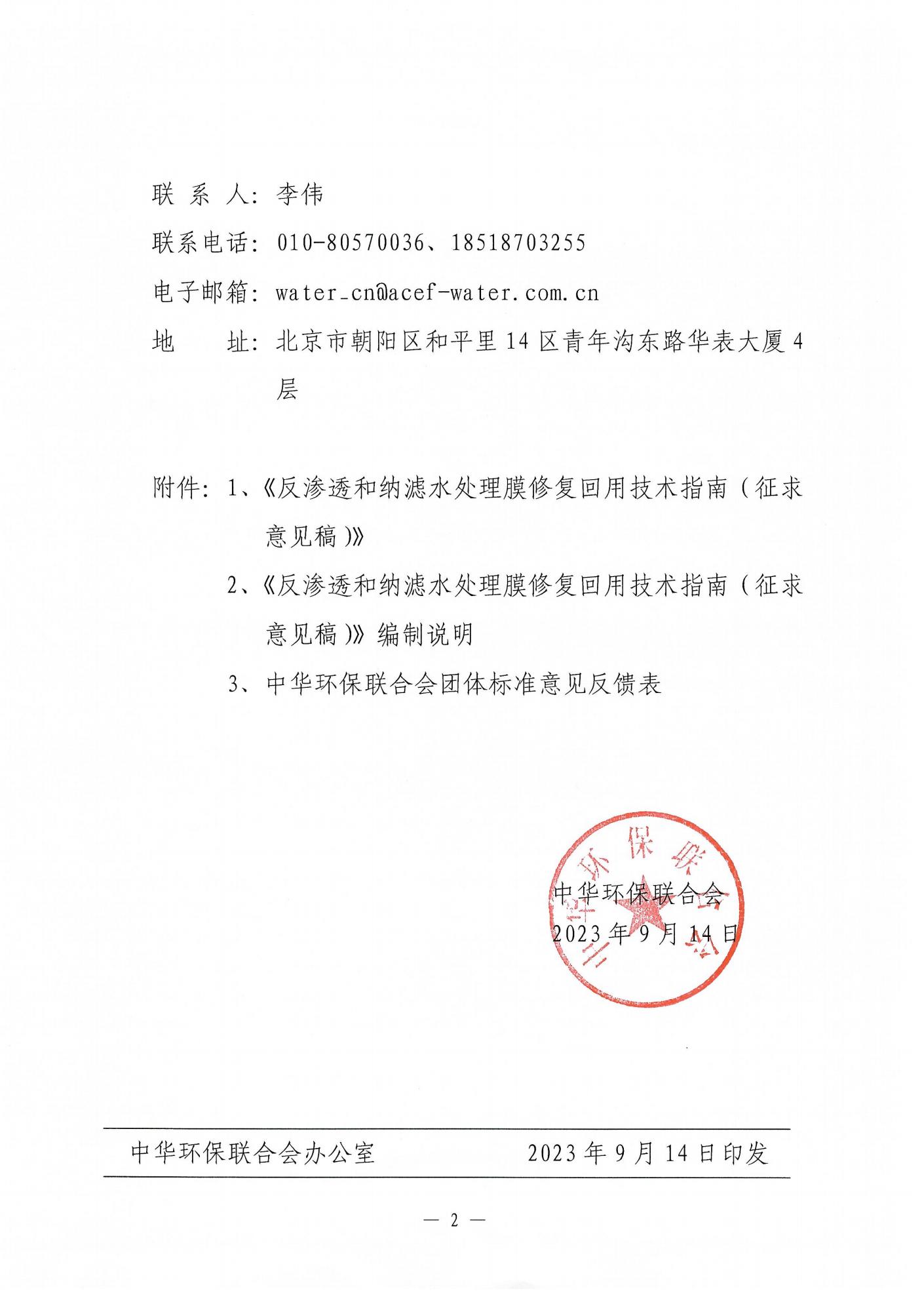 关于公开征求《反渗透和纳滤水处理膜修复回用技术指南》团体标准意见的函