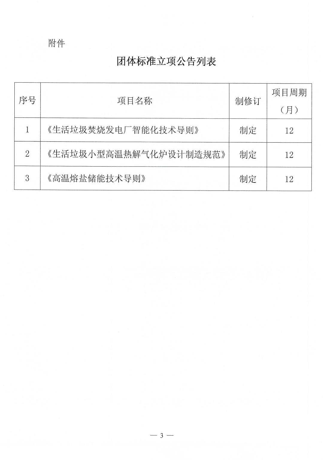 关于《生活垃圾焚烧发电厂智能化技术导则》、《生活垃圾小型高温热解气化炉设计制造规范》、《高温熔盐储能技术导则》三项团体标准立项的公告