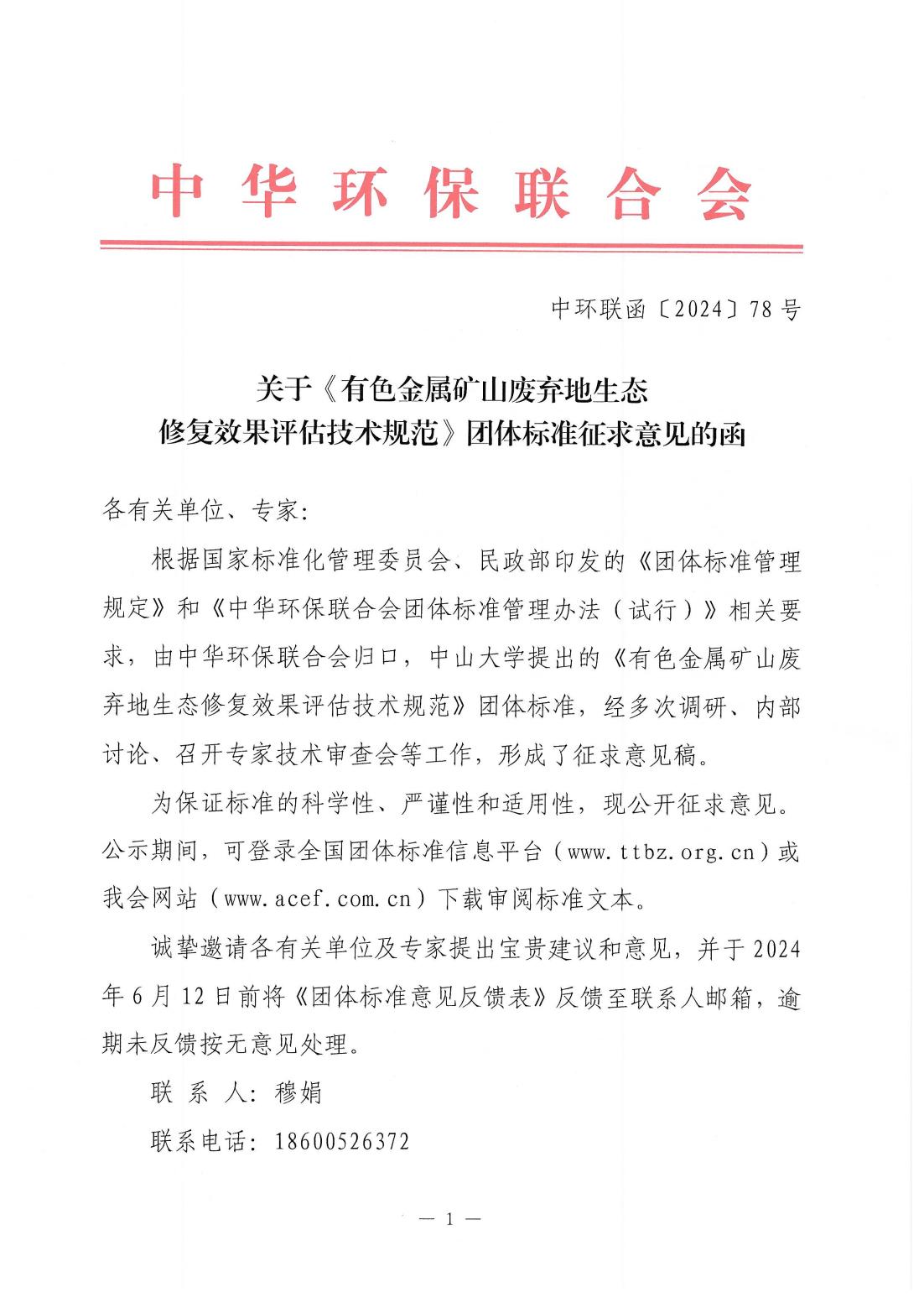 关于《有色金属矿山废弃地生态修复效果评估技术规范》团体标准征求意见的函