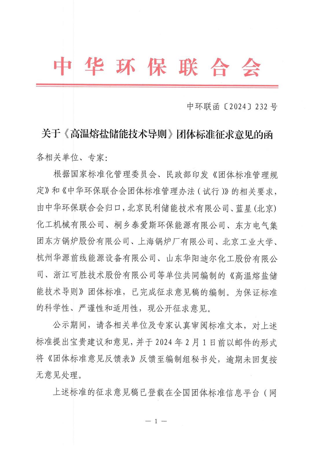 关于《高温熔盐储能技术导则》团体标准征求意见的函