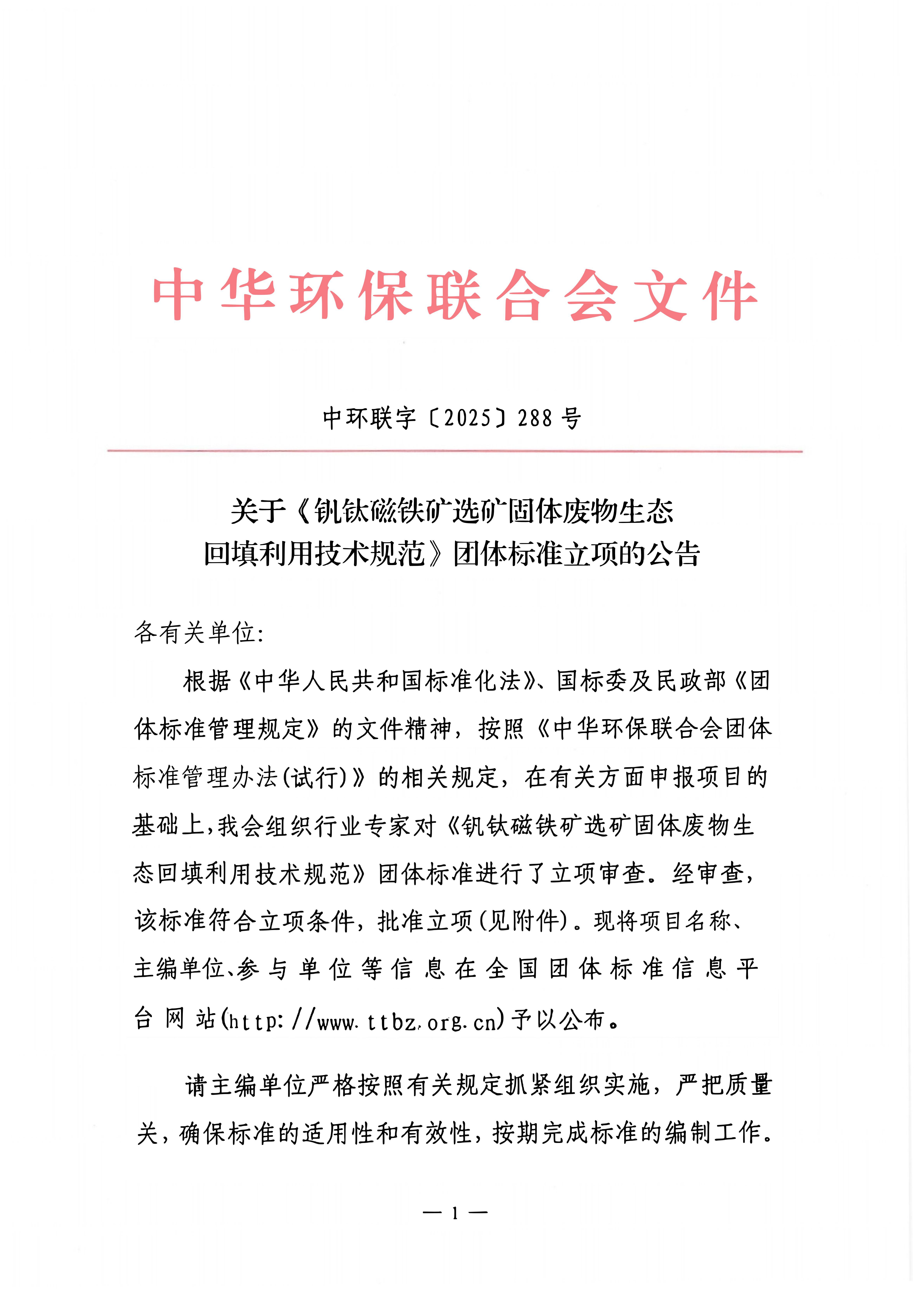 关于《钒钛磁铁矿选矿固体废物生态回填利用技术规范》团体标准立项的公告