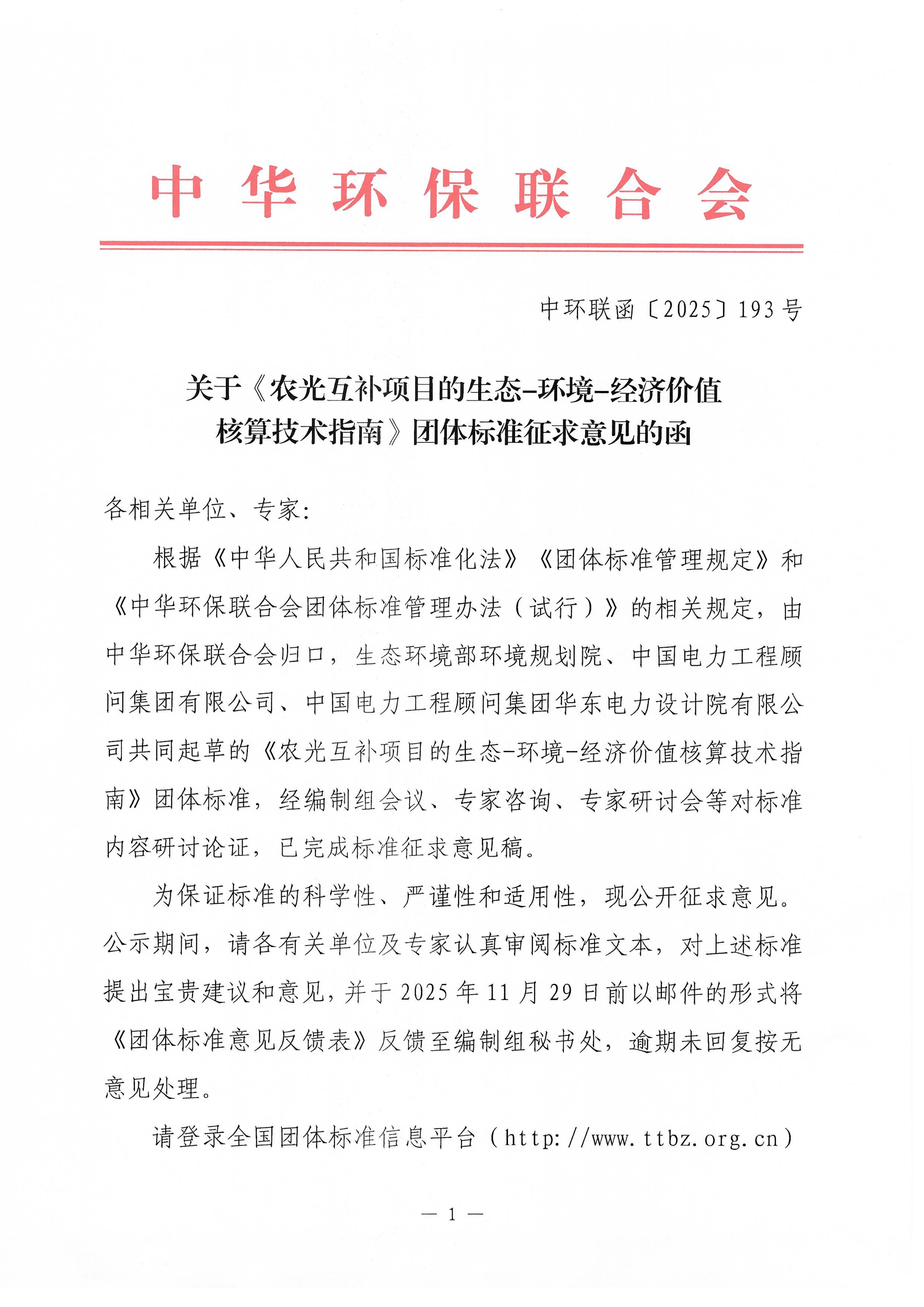关于《农光互补项目的生态-环境-经济价值核算技术指南》团体标准征求意见的函
