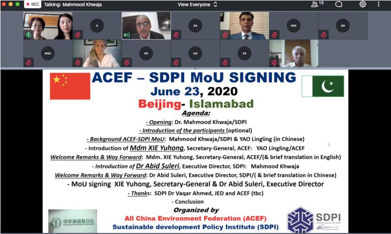 6月23日,中华环保联合会(ACEF)与巴基斯坦可持续发展政策研究所(SDPI)正式签署机构间《合作谅解备忘录》,受疫情影响,签署仪式以远程会议形式召开。中华环保联合会副主席兼秘书长谢玉红与巴基斯坦可持续发展政策研究所执行主任阿比德·苏莱里出席签署仪式并代表双方机构签署文件。联合会国际部全体工作人员与巴基斯坦可持续发展政策研究所研究员近20人参加本次签署仪式。