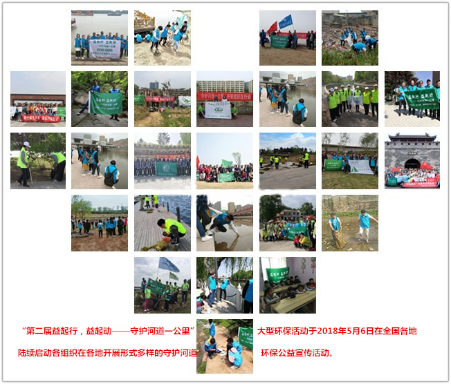 由中华环保联合会发起,全国162家环保组织、爱心企业、知名人士及高校环保社团共同响应开展的第二届“益起行、益起动——守护河道一公里”活动在全国三十多个省、市、自治区同时展开,该活动于2017年3月30日正式启动,参与组织从2017年第一届时的125家增长到162家,现场参与活动人员从2017年的5万人次增长到6.2万人次;各组织形式多样,立说立行,躬身实践,常年坚持,用各自擅长的方式守护我们周边的水环境。全国45家高校环保社团今年积极响应并共同参与守护河道一公里的活动并组织了多场次形式多样的活动。