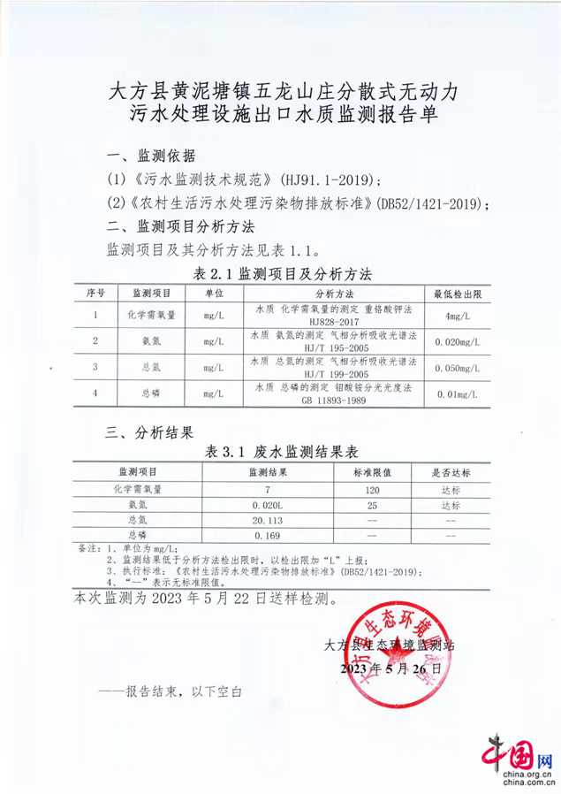 在今年的5月份,大方县生态环境监测站对黄泥塘镇的分散式无动力污水处理设施出口水质进行了取样监测,结果显示达标合格。