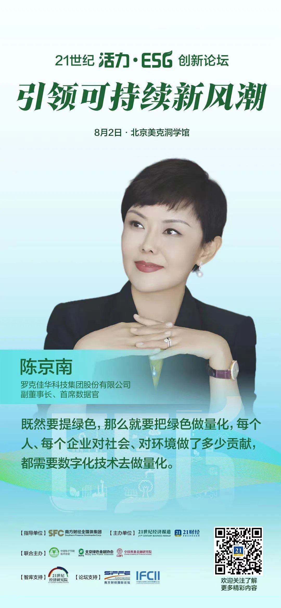 自2020年“碳达峰,碳中和”目标提出以来,践行ESG理念已经成为诸多企业的共同选择。8月2日,2023年度21世纪“活力·ESG”创新论坛在北京召开。作为国内媒体首次在ESG案例征集中探索兼顾国际经验与中国特色的活动,论坛旨在为树立一批ESG典型示范案例,作为企业可持续战略实践的指引参考,陪伴企业长期关注并践行ESG理念。佳华科技副董事长、首席数据官陈京南受邀出席会议。