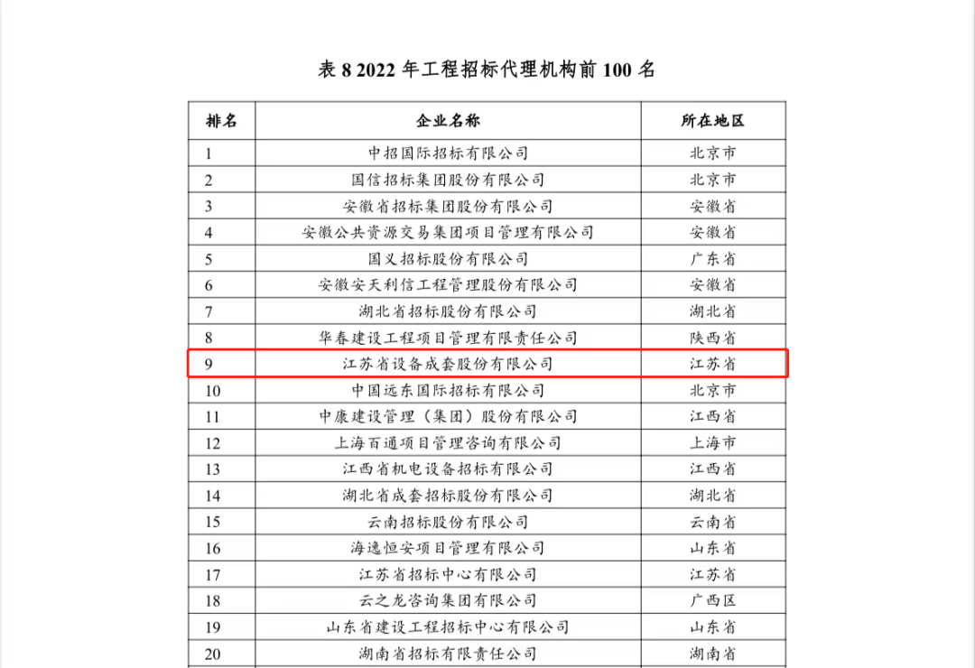 近日,中国土木工程学会建筑市场与招标投标研究分会组织编写的《2022年度工程招标代理行业发展报告》发布,江苏省设备成套股份有限公司(以下简称“成套公司”)入选