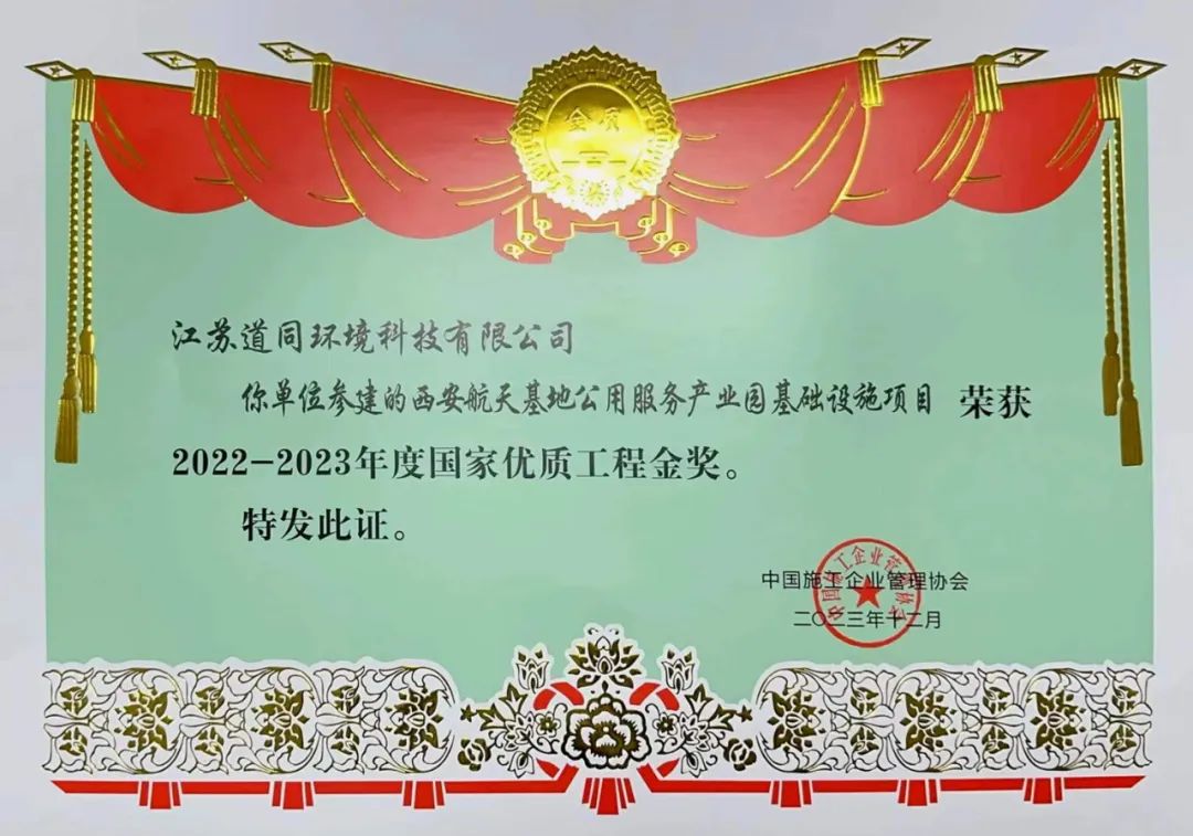 近日,中国施工企业管理协会公示了《2022-2023年度第二批国家优质工程奖候选项目名单》江苏道同环境科技有限公司作为西安航天基地用服务产业园基础设施(南、北地块)项目参建方之一榜上有名!