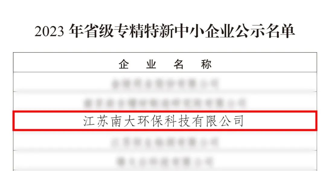 12月14日,江苏省工业和信息化厅发布《关于江苏省2023年专精特新中小企业和2020年度专精特新企业复核通过企业名单的公示》,江苏南大环保科技有限公司成功入选2023年江苏省省级专精特新中小企业名单。
