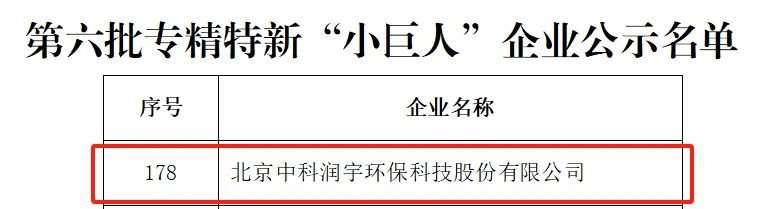 近日,工业和信息化部及北京市经济和信息化局公布第六批专精特新“小巨人”名单,中科环保成功入选,被评为国家级专精特新“小巨人”。