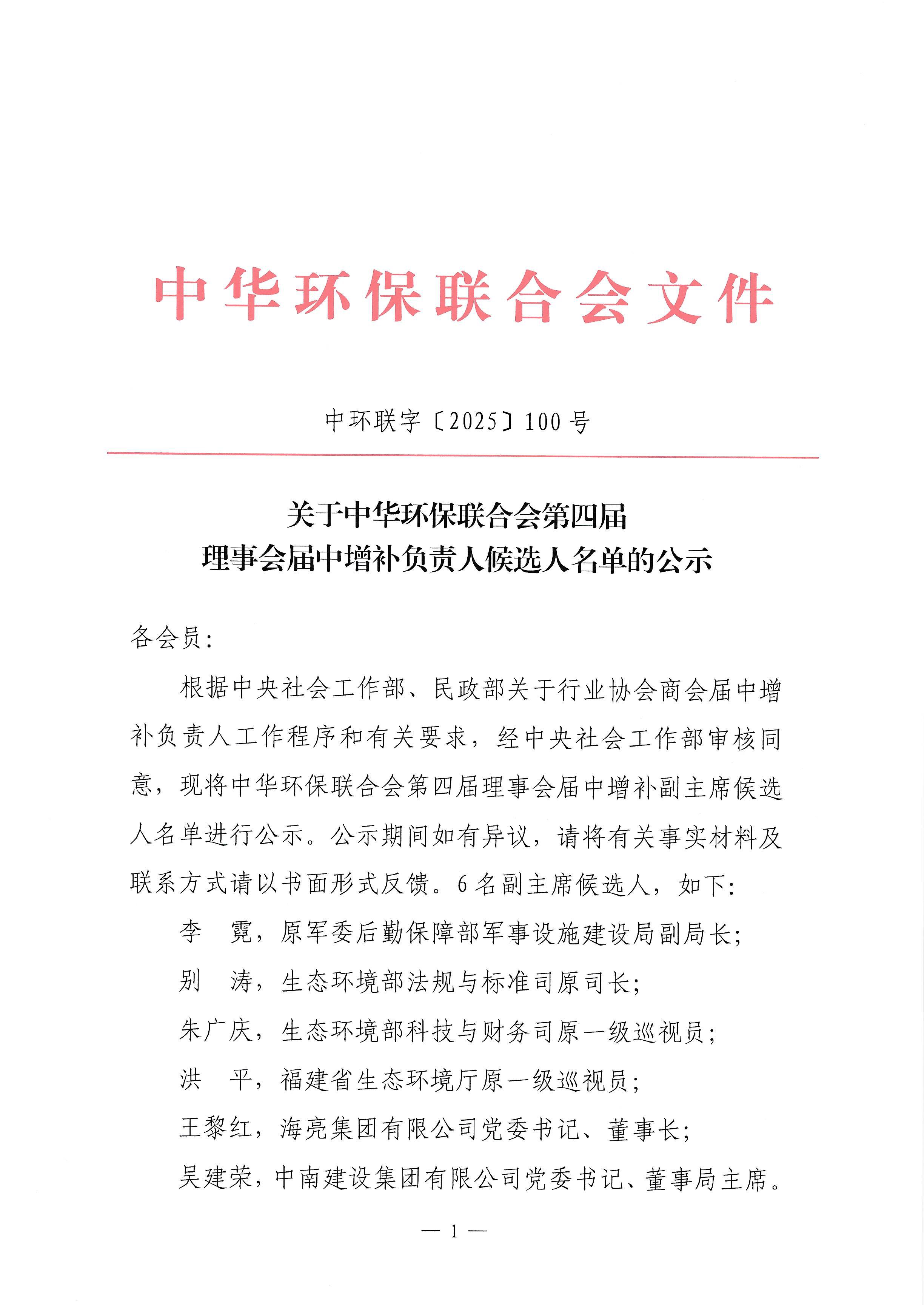 关于中华环保联合会第四届理事会届中增补负责人候选人名单的公示