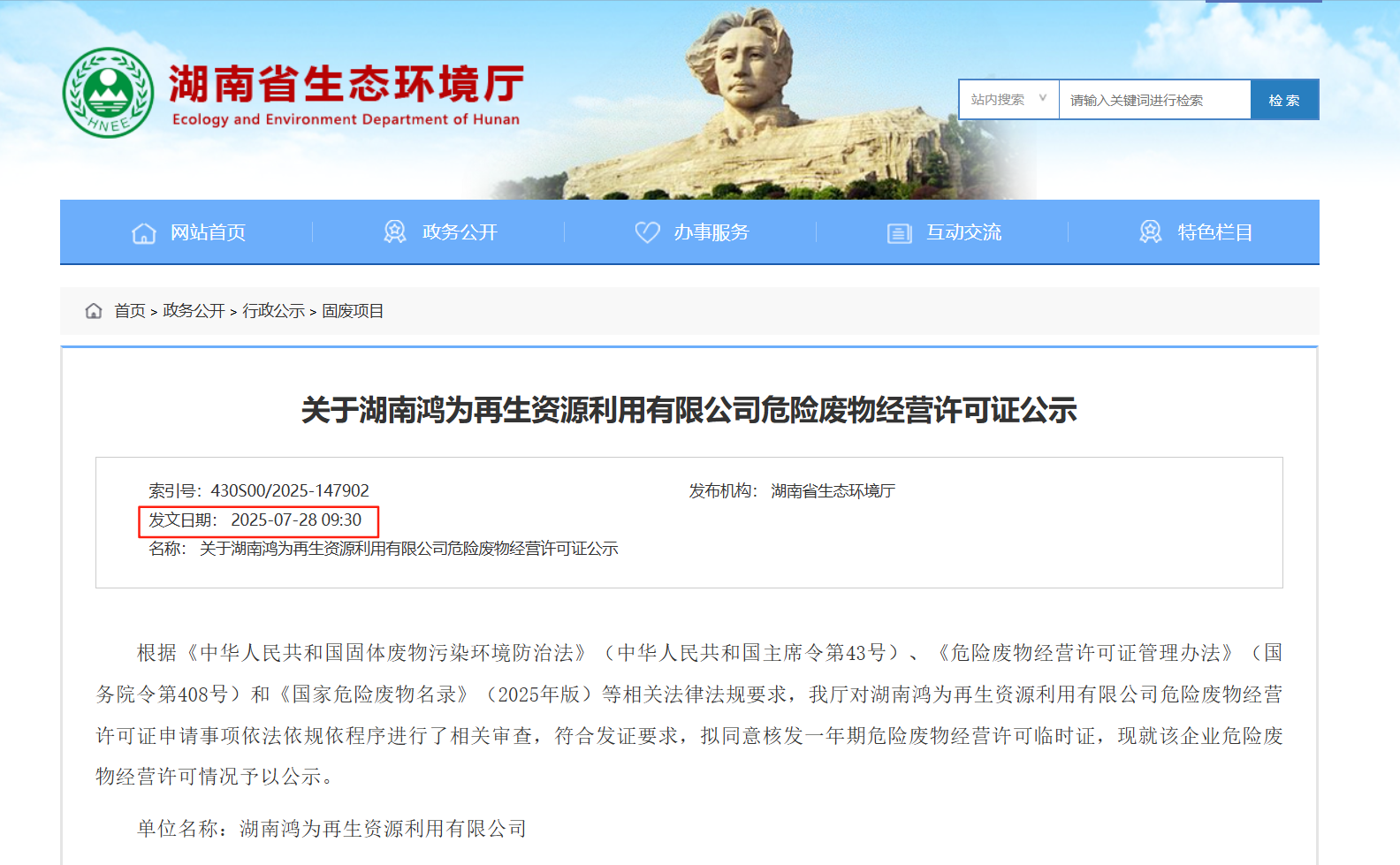 湖南鸿为再生资源利用有限公司(简称“湖南鸿为”)2025年8月5日正式获颁湖南省生态环境厅核发的《危险废物经营许可证》(湘环(危临)字第(325)号)。这标志着岳阳临湘20000吨/年活性炭“再生绿岛”项目全面具备合法运营资质并投入运行,将为区域企业提供废活性炭处置“一站式”解决方案,强力助推绿色低碳发展。