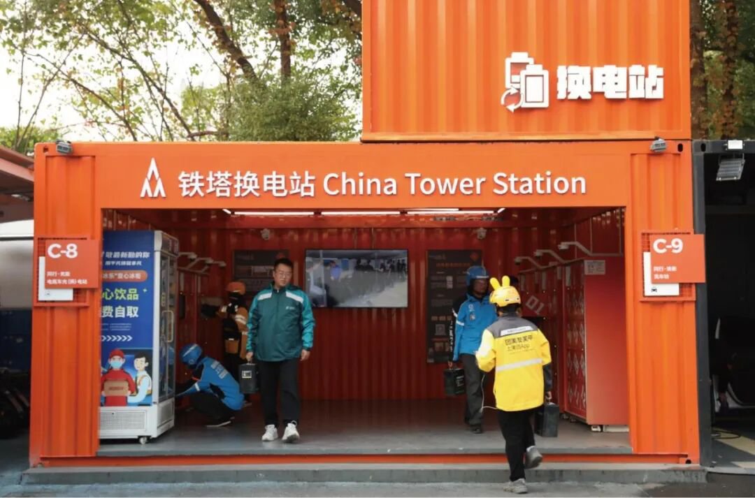 在湖北武汉,一座20米高的通信塔搭载5G天线,塔基配有通信机房,塔旁安装的智能换电柜已成为外卖骑手的“能量补给站”,用户10秒即可完成电池更换。