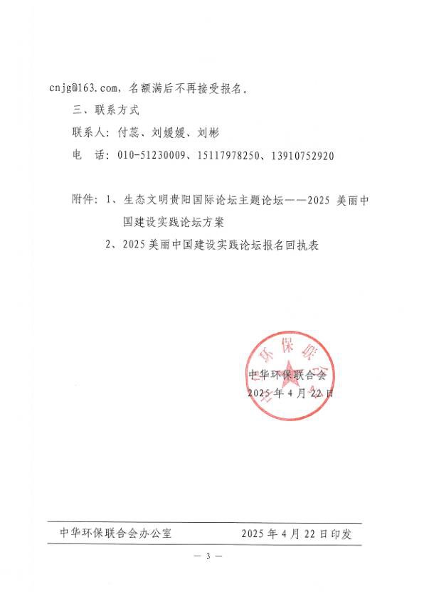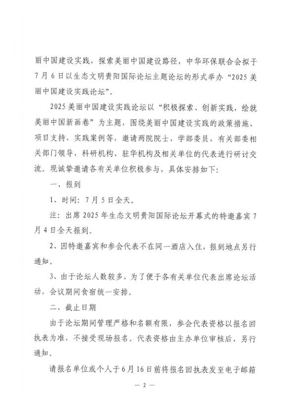 为了深入学习贯彻习近平生态文明思想,深入贯彻落实党中央、国务院关于全面推进美丽中国建设的决策部署,积极推进美丽中国建设实践,探索美丽中国建设路径,中华环保联合会拟于7月6日以生态文明贵阳国际论坛主题论坛的形式举办“2025美丽中国建设实践论坛”。