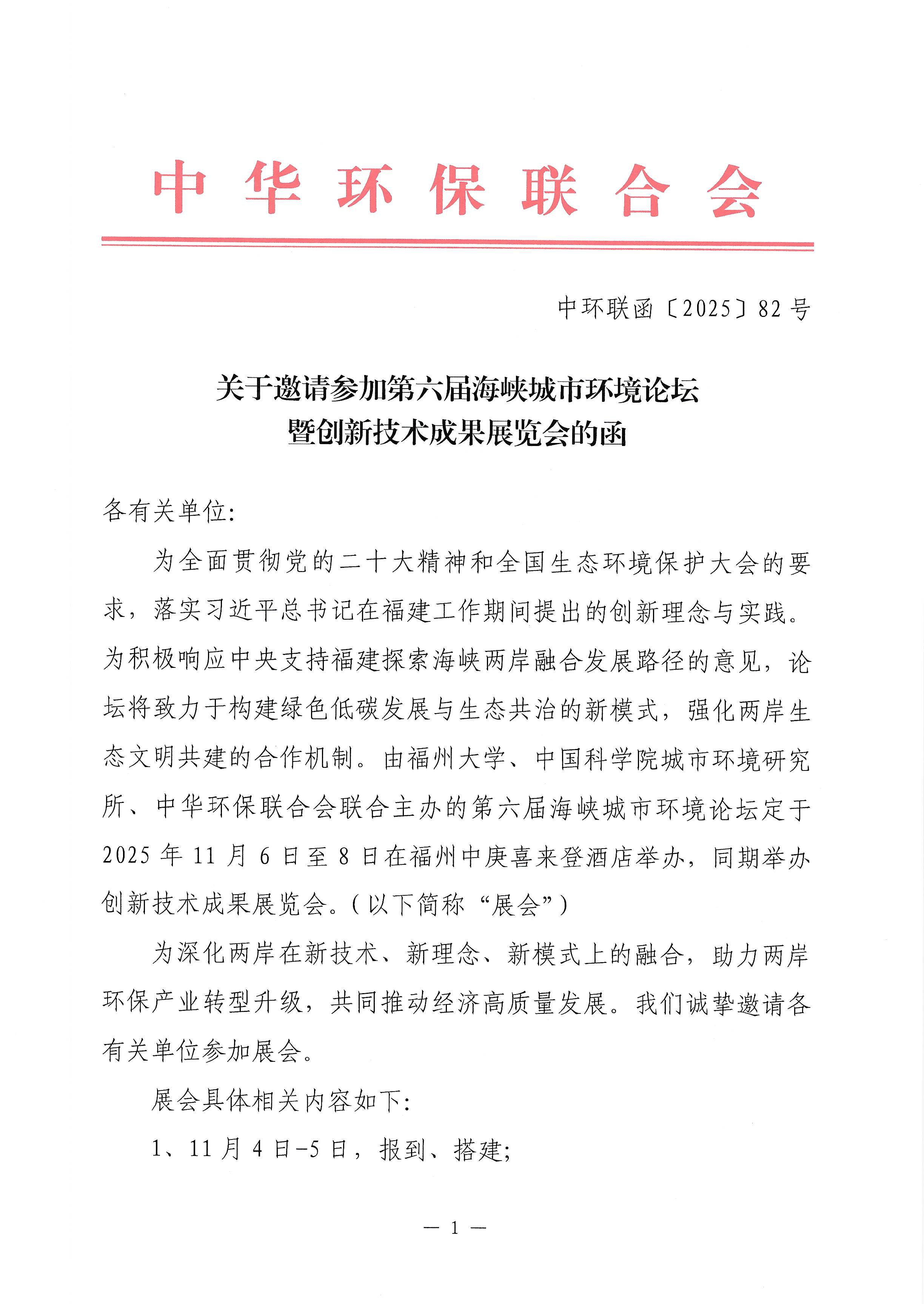 关于邀请参加第六届海峡城市环境论坛暨创新技术成果展览会的函