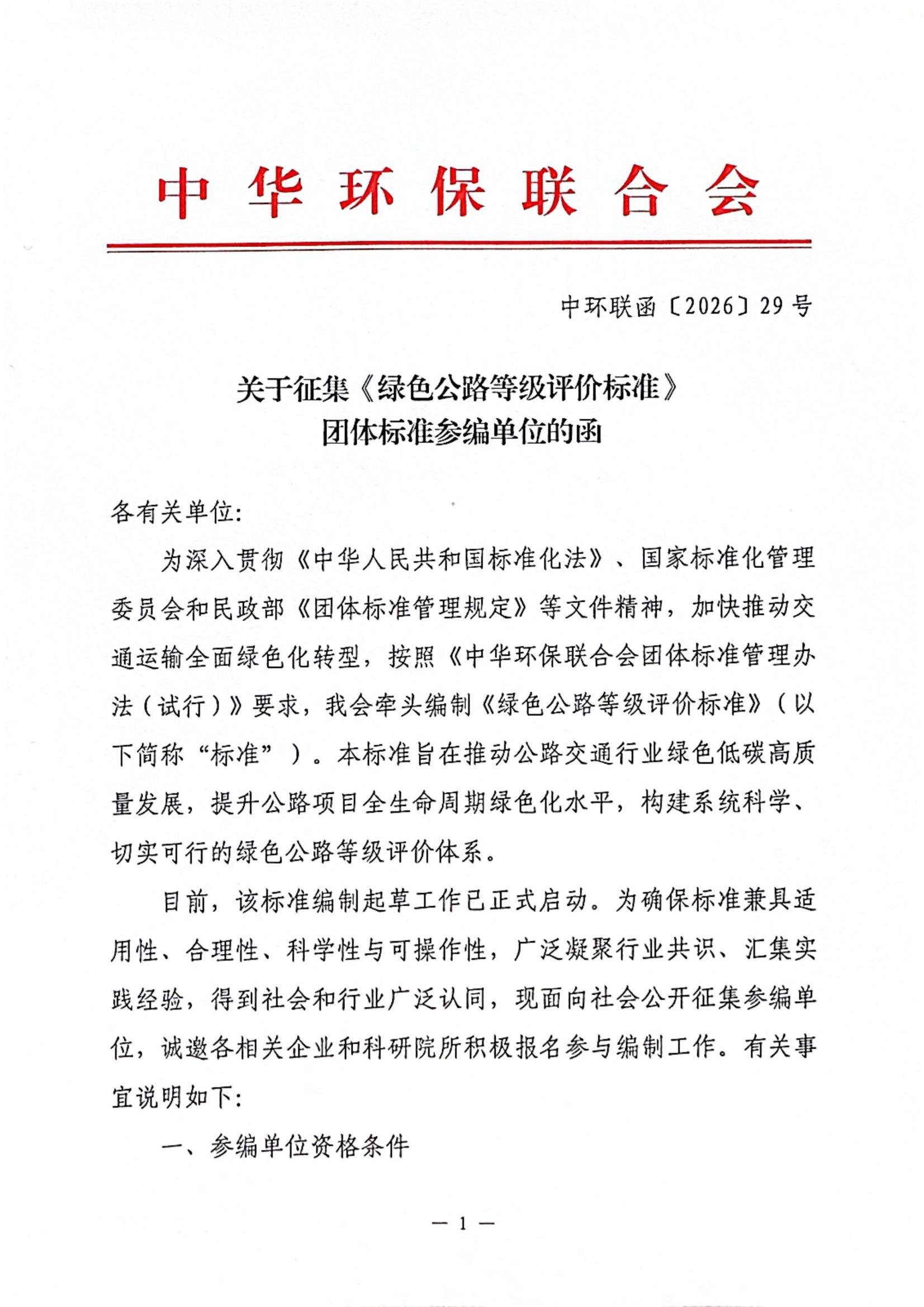 关于征集《绿色公路等级评价标准》团体标准参编单位的函