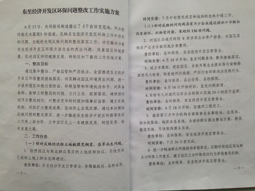 2015年5月,我会联合中央电视台对安徽省池州市东至县香隅化工园环境问题进行了联合调研,调研发现园区排放的工业废水中苯含量超标136倍,对附近的灌溉河道造成污染,并对下游长江的水质安全构成威胁。6月17日,央视《新闻直播间》对该环境问题进行了曝光,引起了当地政府的高度重视,“池州市委市政府要求东至县立即做出整改,园区全部37家企业立即全部自查整改,通河两岸8家涉苯企业立即停产整顿,加快推进园区雨污分流系统治理工程进度,从源头上彻底杜绝污水排放的问题”。7月3日,东至县人民政府向我会发来《东至经济开发区环保问题整改工作实施方案》,方案对经开区环保问题制定了整改目标和具体工作任务完成时序,并落实了保障措施。