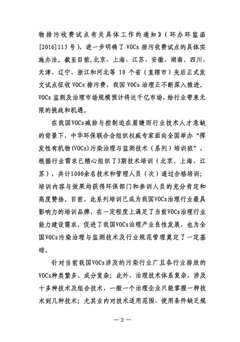 中华环保联合会关于举办“第四期挥发性有机物(VOCs)污染治理与监测技术高级培训班”的通知