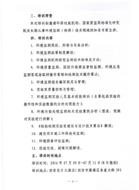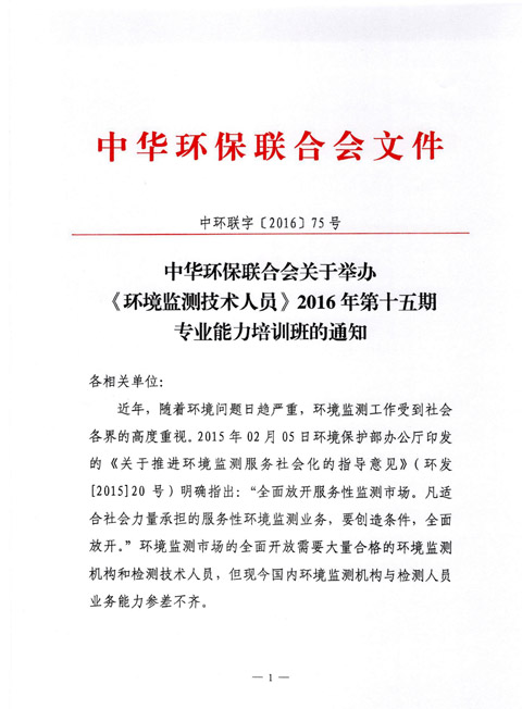 中华环保联合会关于举办《环境监测技术人员》2016年第十五期专业能力培训班的通知