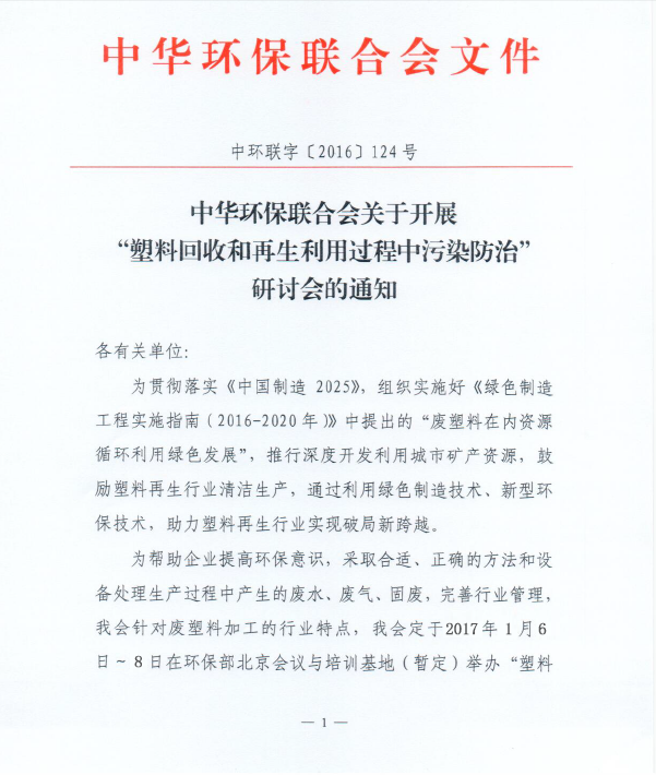 中华环保联合会关于开展“塑料回收和再生利用过程中污染防治”研讨会的通知