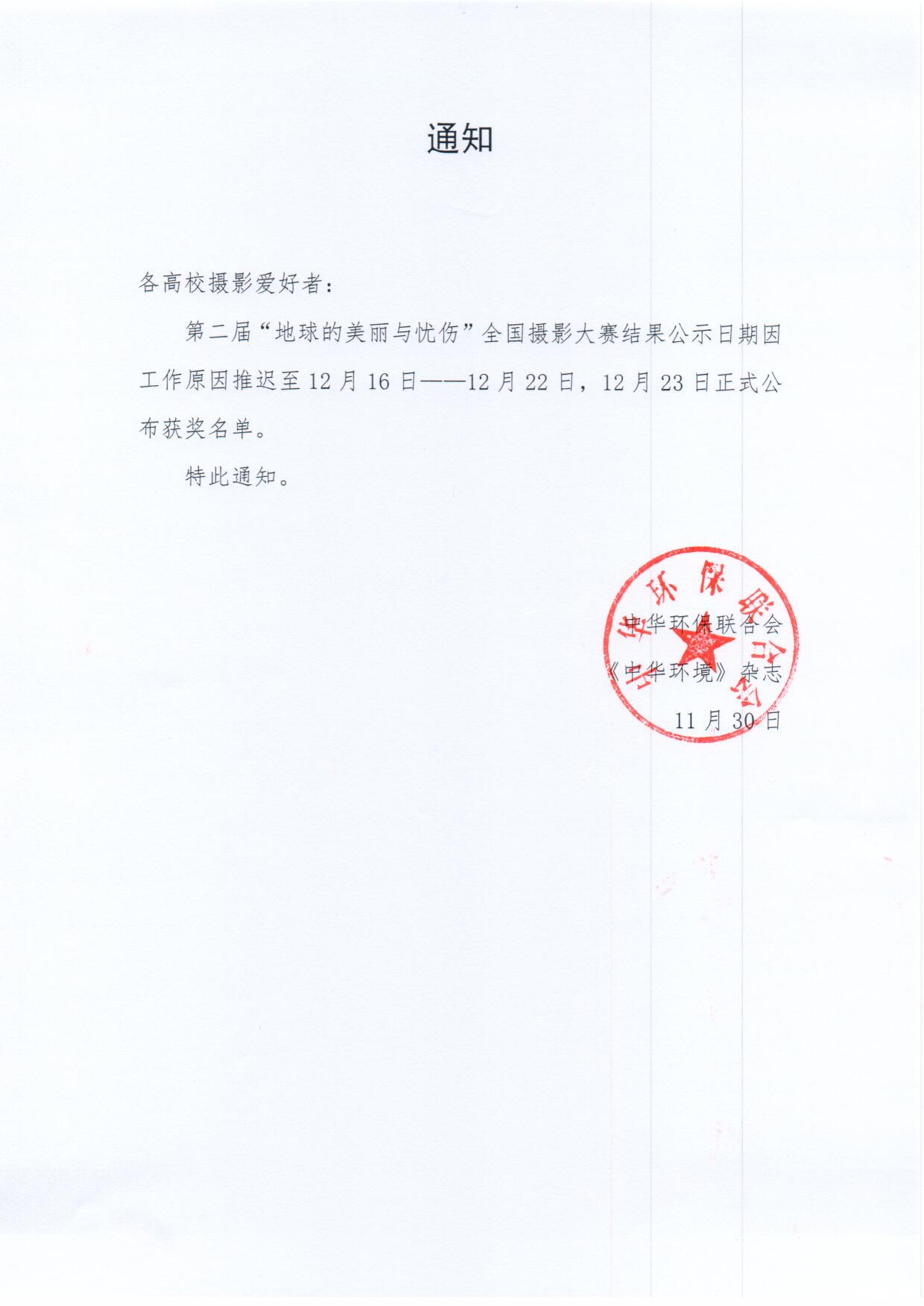 关于推迟公布“地球的美丽与忧伤”全国环境摄影大赛比赛结果的通知
