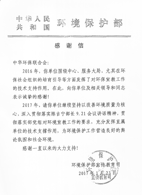 新年伊始,环境保护部宣传教育司向我会发来感谢信,充分肯定了我会2016年在环保组织培育引导等方面的工作成就,并就2017年工作提出相关要求。