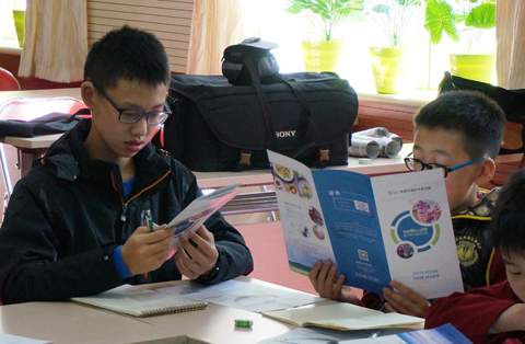 小学生们在仔细阅读“减少食物浪费”手册