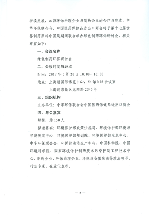 中华环保联会会关于举办绿色制药环保研讨会的通知