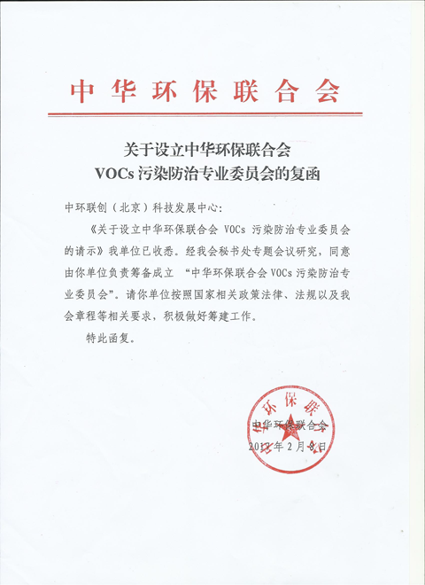 关于设立“中华环保联合会VOCs污染防治专业委员会”的复函